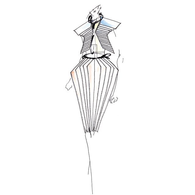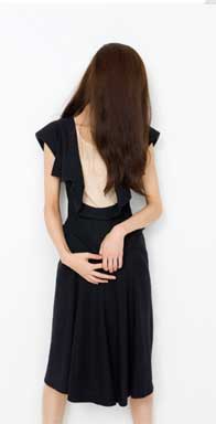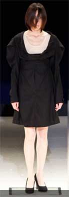 相対的な物の見方が、絶対的な服の着方を変える、をコンセプトに製作。鏡に映る世界はすべてのものが前後反転していることと同じと考えたことから「後ろの正面」をテーマにしました。ウールジョーゼットを使用し、腰回りの膨らみや、流動的で構築的なラインが特徴的な作品を作りました。