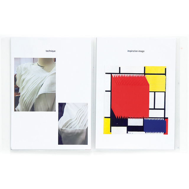 モンドリアンの「赤・青・黄のコンポジション」からのインスピレーションです。幾重にも重ねた綿やシルクで生きた立体を表現しようと製作しました。1枚1枚の布をボディの凹凸に合わせ立体裁断し、400枚以上のパーツをつないでシルエットを形成しています。